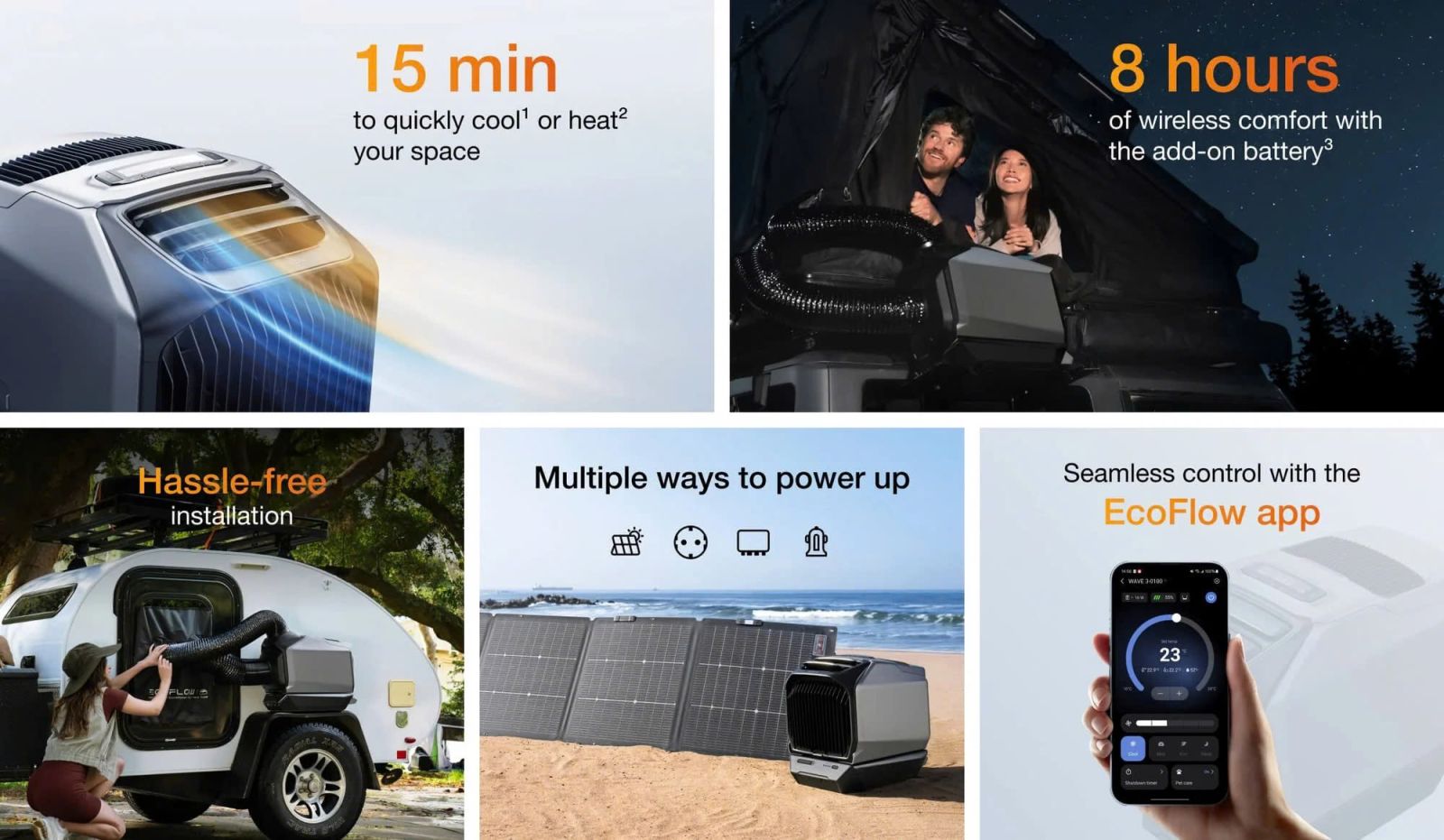 với công suất 6100 BTU, tạo môi trường lý tưởng cho mọi tình huống. Làm ấm nhanh chóng với công suất sưởi 6800 BTU, tăng nhiệt độ lên 9°C/17°F chỉ trong 15 phút², hoàn hảo để giữ ấm trong các hoạt động ngoài trời lạnh giá như cắm trại mùa thu.