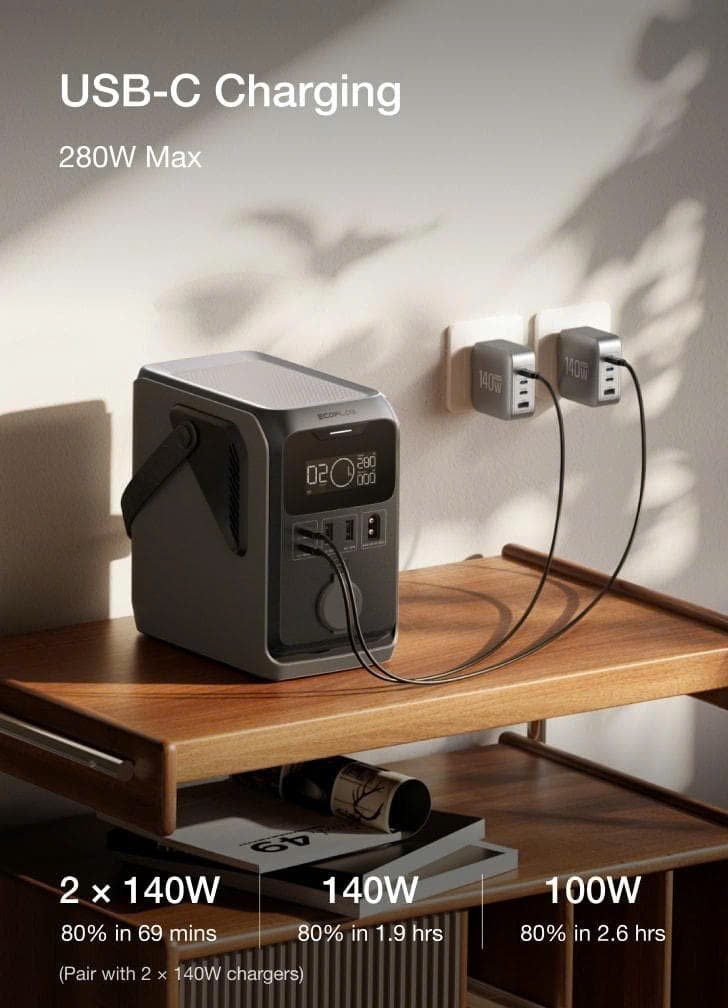 Nguồn điện DC thuần cung cấp tổng công suất 300W (tối đa 140W cho mỗi cổng, bao gồm cả cổng xe hơi 12V) — đủ cho 90% thiết bị ngoài trời thiết yếu. Hoàn hảo cho mọi nhu cầu điện nhẹ khi cắm trại.