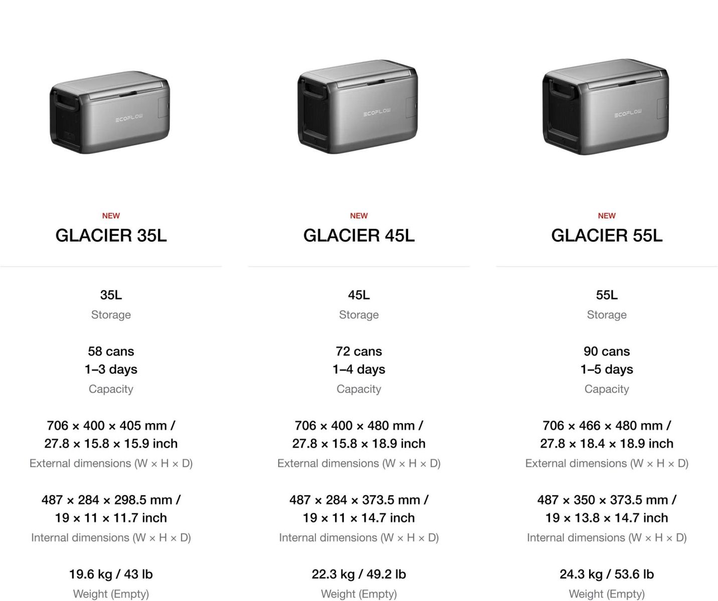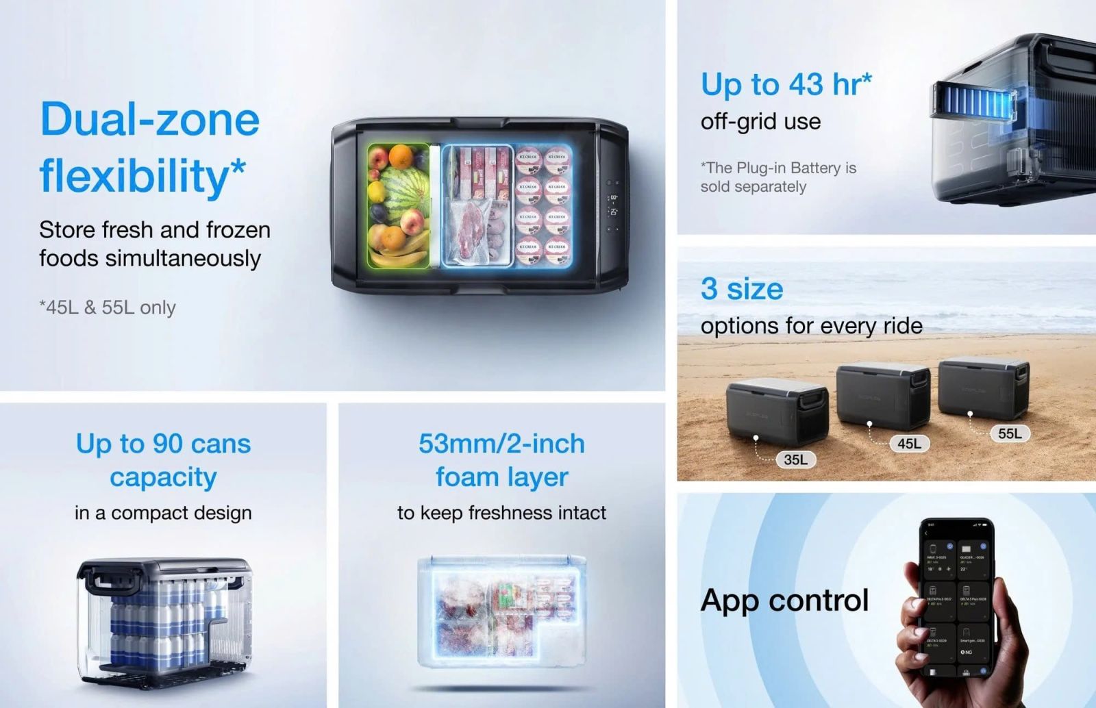 EcoFlow GLACIER Classic tối ưu hóa hiệu quả lưu trữ, chứa được 58 lon (35L), 72 lon (45L) và 90 lon (55L) nước ngọt 330ml mà vẫn gọn gàng và tiết kiệm không gian.