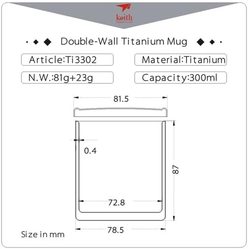 Cốc hai lớp KEITH được làm từ titan nguyên chất, có khả năng chống axit và kiềm, chống ăn mòn, bền bỉ và chắc chắn.