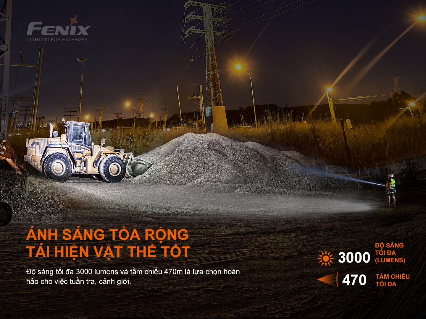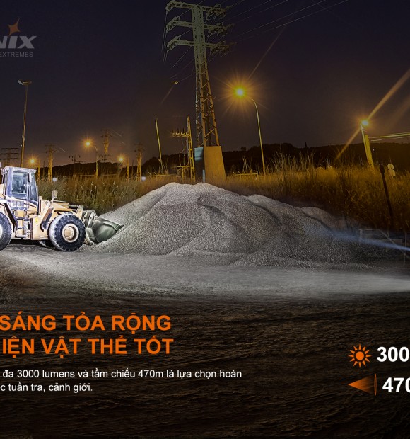- Đèn pin siêu sáng có công suất lớn, đến 3000 lumens và chiếu xa 470m, sẽ trở thành một công cụ hữu dụng cho bạn trong công việc.
