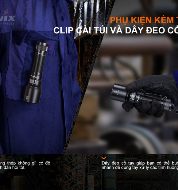 - Đèn pin Fenix C7 có chuôi đáy bằng phẳng, tích hợp nam châm cực khỏe, dính tốt trên các bề mặt thép, cho bạn có thể rảnh thay khi thao khác làm việc. Đi kèm clip gài chắc chắn, có thể gài vào túi áo hoặc balo. Dây đeo chống rớt khi sử dụng.