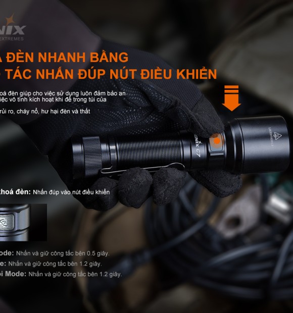 - Luôn khóa đèn khi không sử dụng để tránh tình trạng kích hoạt ngẫu nhiên trong quá trình bảo quản hoặc vận chuyển.