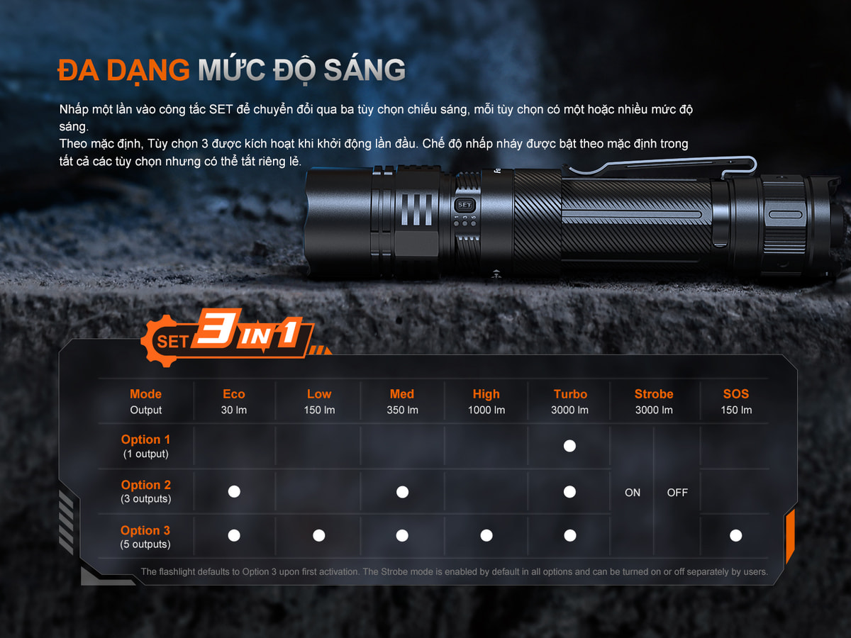 Fenix PD36R ACE cho phép người dùng tùy chỉnh giao diện sử dụng qua công tắc SET (nút nhỏ ẩn dưới cổ đèn).