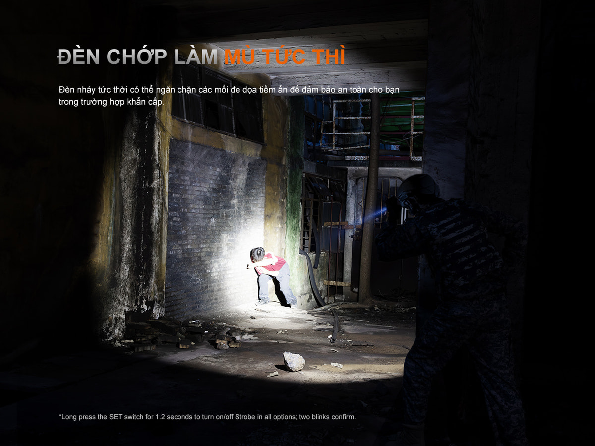 Khi đèn đang bật hoặc tắt, nhấn giữ công tắc thân khoảng 0.5 giây để kích hoạt Strobe.