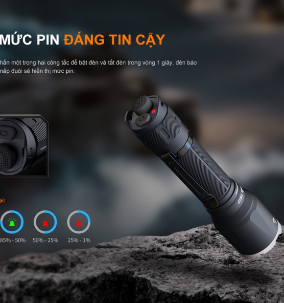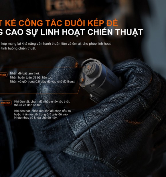 Công tắc kép đuôi (E-switch không gây tiếng động): Điều khiển nhanh nhạy, có thể kích hoạt ngay Burst hoặc Strobe chỉ với 1 thao tác. Thiết kế lý tưởng cho thao tác 1 tay, kể cả khi đeo găng tay chiến thuật. Trên công tắc còn trang bị 1 LED để báo mức pin còn lại bên trong đèn.