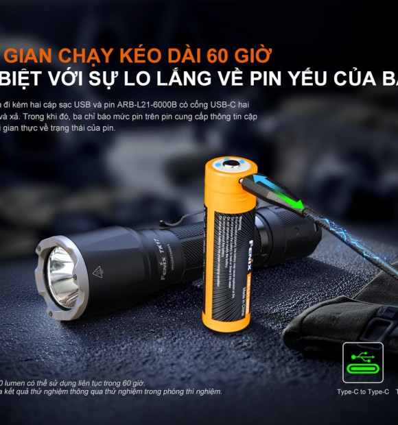 Đèn sử dụng 1 viên pin sạc Li-ion 21700 dung lượng 6000mAh (cao hơn 1000mAh so với pin 5000mAh trên TK16 V2.0), thời lượng sáng tối đa của TK17 đạt đến 60 giờ (mức thấp)
