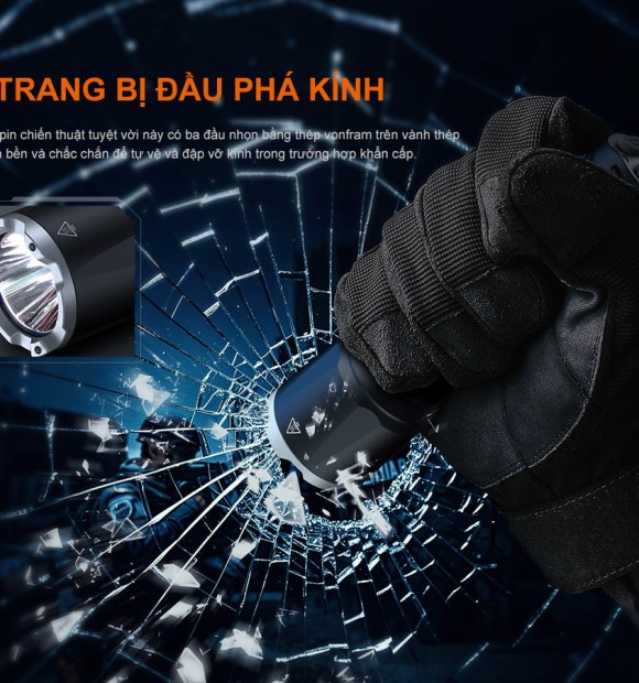 Đèn pin Fenix TK17 có vòng benzel 5 góc cạnh kết hợp 3 đầu phá kính tungsten siêu cứng (HRA90) – đủ khả năng phá vỡ kính xe hoặc vật cản trong những tình huống sinh tử. Thiết kế này đồng thời bảo vệ chóa đèn khi va chạm.