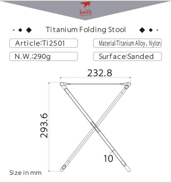 Ghế xếp Titanium Folding Stool Keith Ti2501, khung đỡ được làm từ hợp kim titan cường độ cao, nhẹ, mỏng và chắc chắn, kích thước nhỏ gọn nhưng độ bền cao, chống ăn mòn và không dễ bị gỉ.