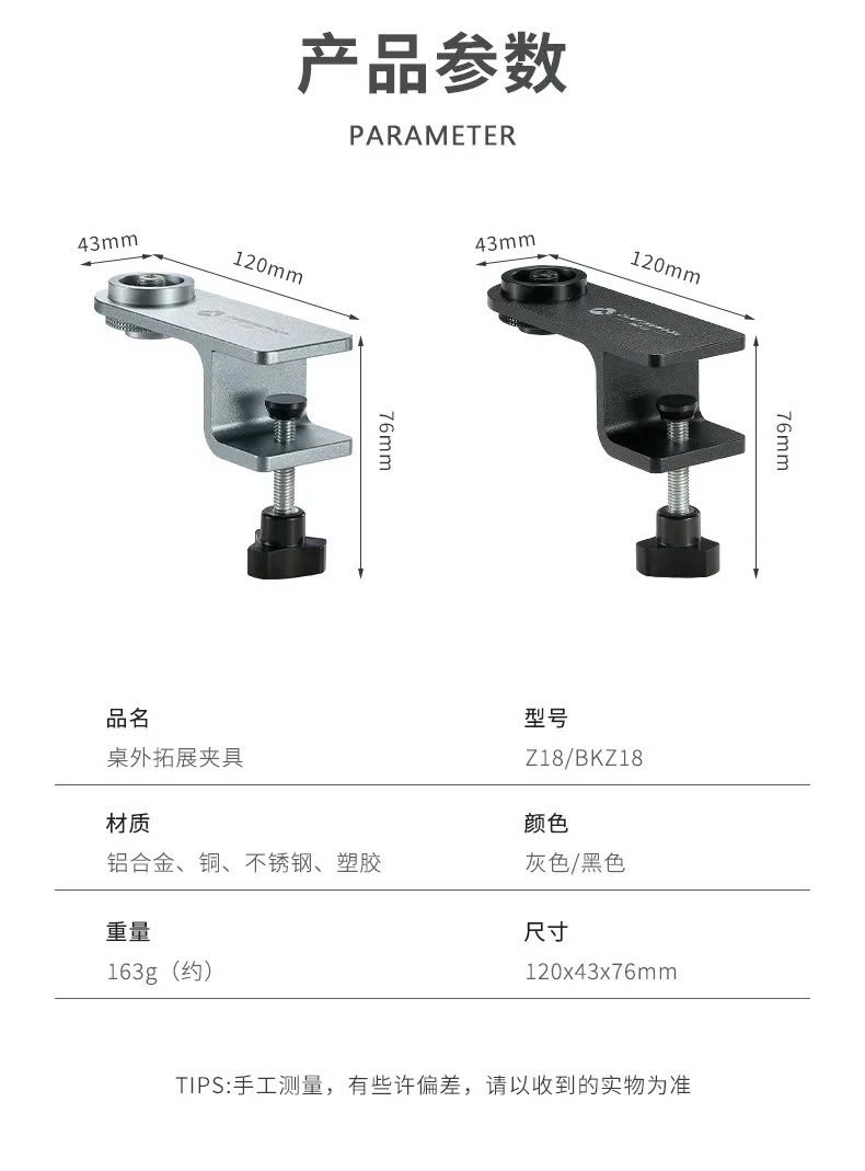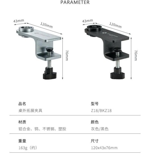 Kẹp tương thích với các loại bàn có độ dày từ 1 đến 25 mm và có thể kết nối với hầu hết các loại bàn ngoài trời, bao gồm Bàn CK-3650, Bàn Slim Roll T-520 và Bàn Tactical T-510.