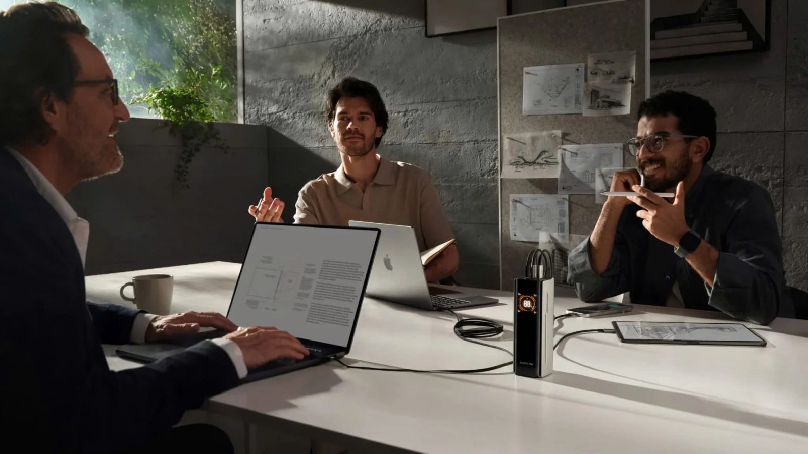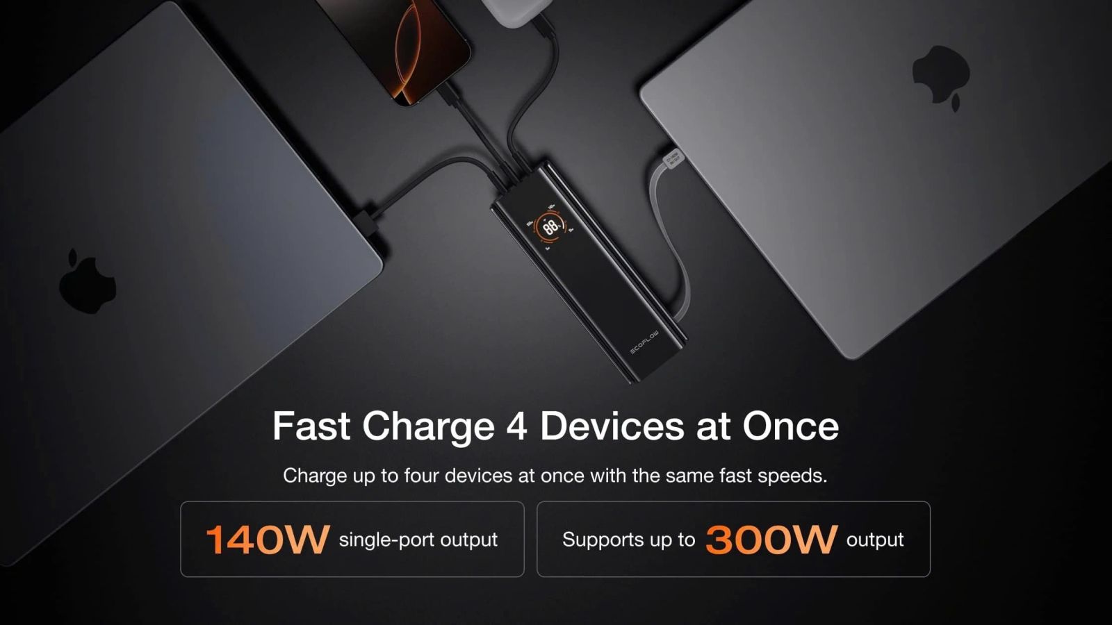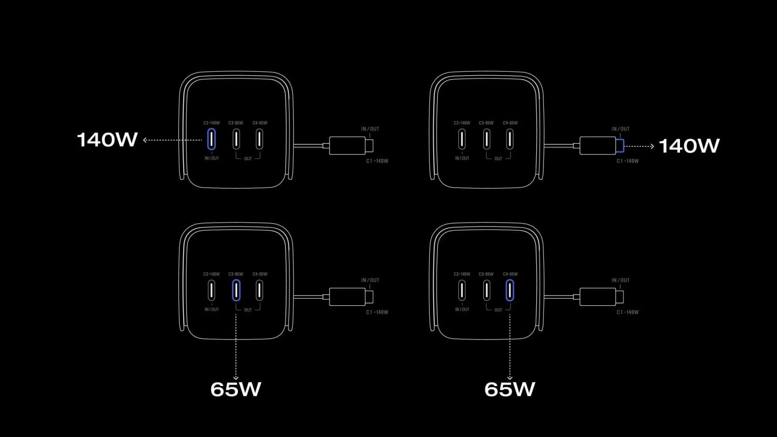 - Sạc nhanh nhiều thiết bị: Tổng công suất đầu ra (4 cổng): 300W, 1 cáp USB-C có thể thu vào 140W, 1 cổng USB-C 140W, 2 cổng USB-C 65W.