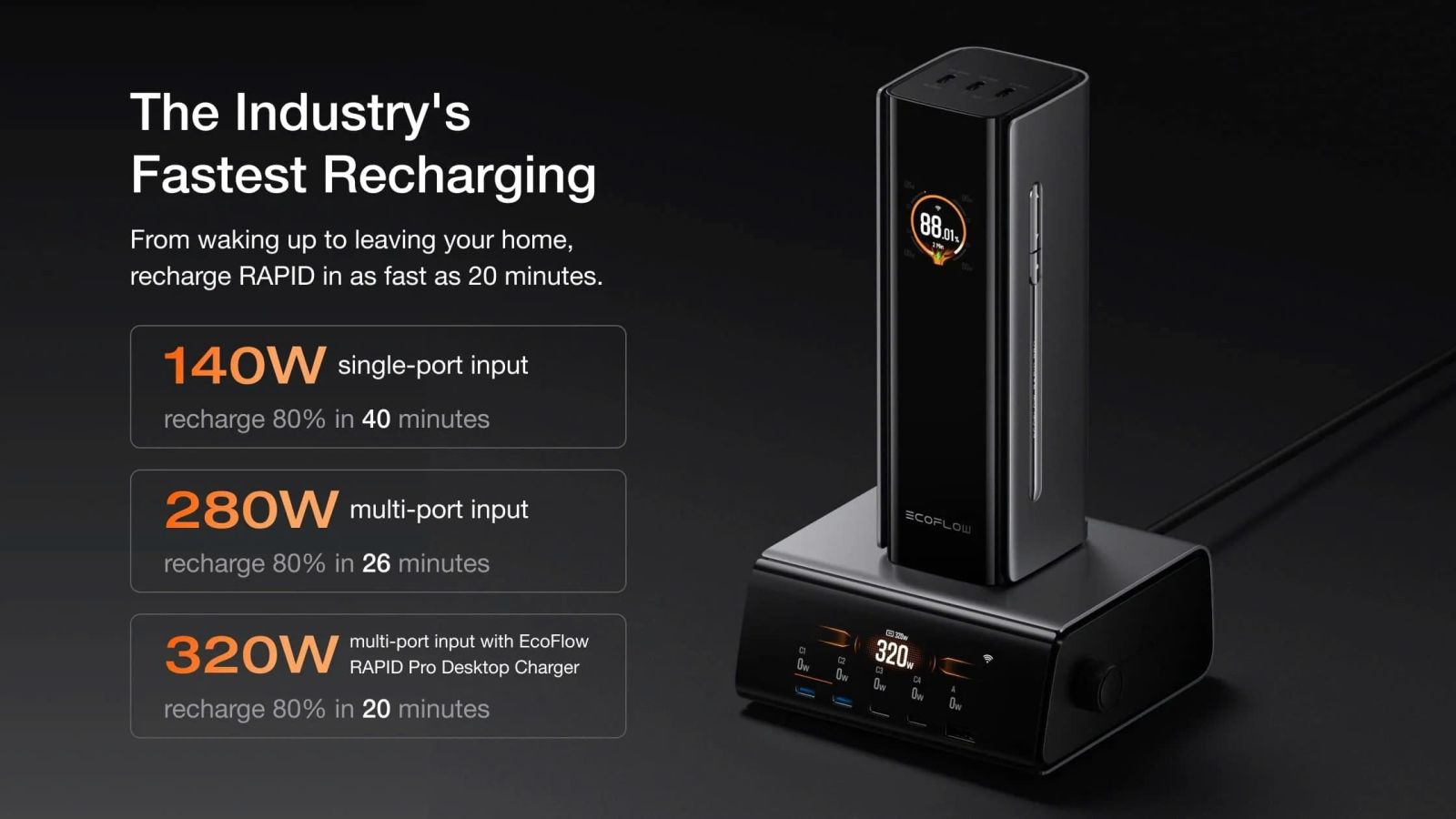 - Tốc độ sạc nhanh: 20 phút để sạc lại 80% khi sử dụng Trạm sạc EcoFlow RAPID Pro 320W.²