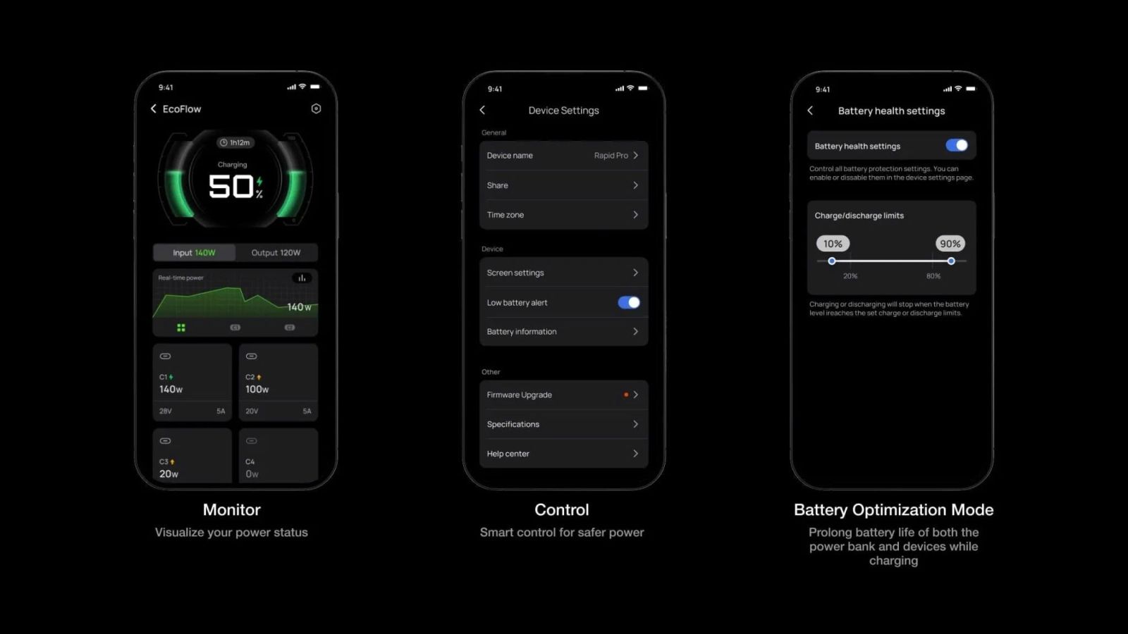 - Kiểm soát nguồn điện thông minh thông qua ứng dụng EcoFlow: Thiết lập chế độ tối ưu hóa pin để kéo dài tuổi thọ pin của cả sạc dự phòng và thiết bị trong khi sạc.