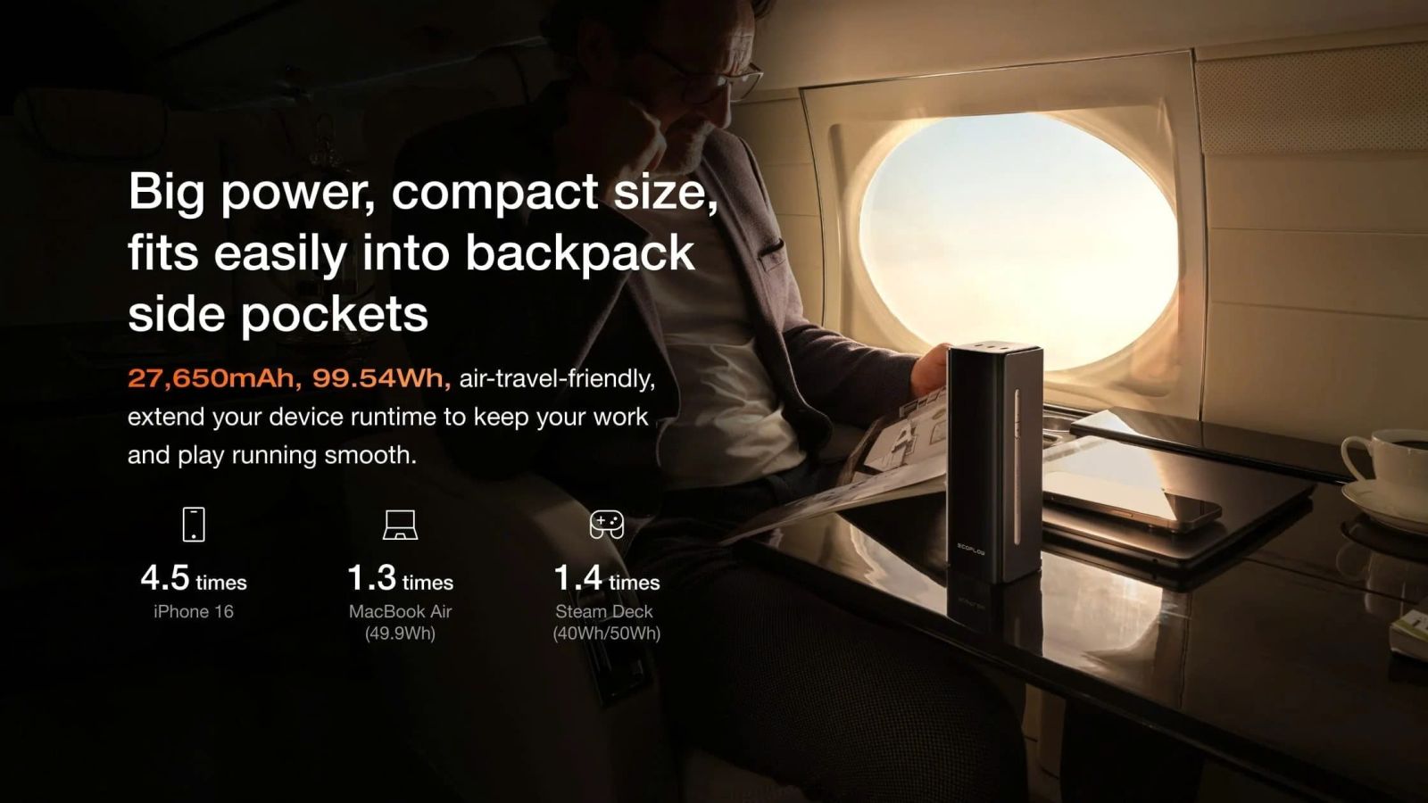 - Kích thước nhỏ gọn, công suất lớn: 27.650mAh (99,54Wh) Thích hợp khi đi máy bay.¹
