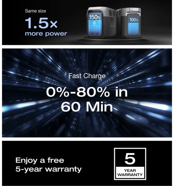 - Sạc nhanh 1 500 W qua nguồn AC – chỉ mất khoảng 90 phút để sạc đầy từ 0–100%.